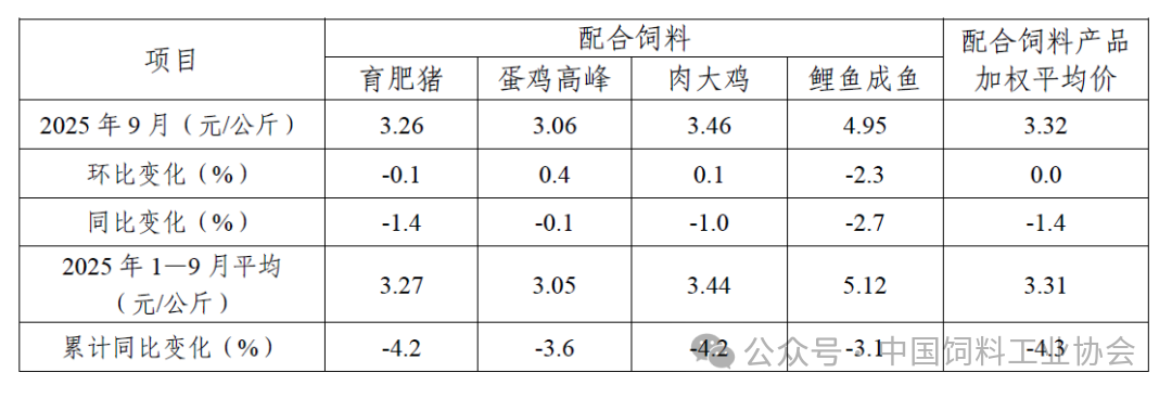 表2 2025年9月饲料企业配合饲料平均价格