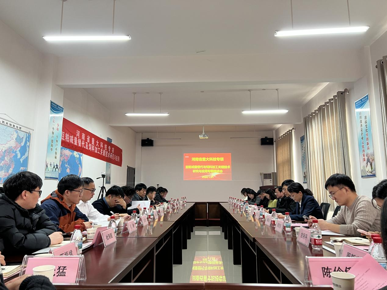 1月31日下午,河南省重大科技专项“豆粕减量替代与饲料加工关键技术研究与应用”专题推进会——饲料膨化加工与豆粕减量替代研讨推进会,在河南神农膨化饲料科技有限公司会议室隆重举行。本次会议由项目首席专家陈文教授主持,汇聚了来自河南省农业农村厅、省级科研院所及省内多家重点饲料养殖企业的领导、专家与代表,共同围绕饲料膨化加工技术创新与豆粕减量替代路径展开深度研讨,聚力推动我省饲料行业绿色可持续发展。