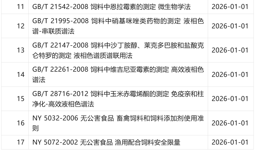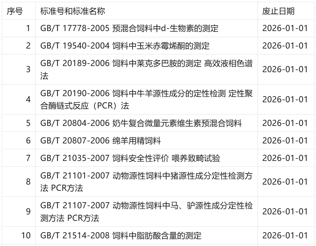 2026年1月作废的饲料相关国家标准、行业标准汇总